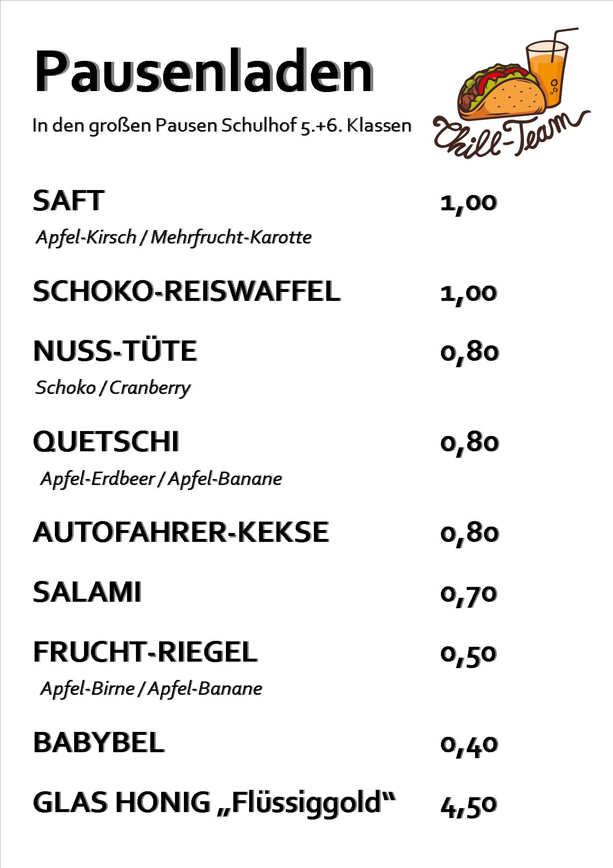 Bereits seit 2005 gibt es sie schon in der Siegfried-Marcus Schule, die Schülerfirma „ChillTeam“, die für die Verpflegung in den großen Pausen sorgt. Neben der Kantine im Stadthaus, bereitet das Chillteam, das vom Schulsozialarbeiter begleitet wird, einen täglichen kleinen Imbiss für alle Schüler und Lehrer zu. Erwerben kann man dort für wenig Geld allerlei Leckereien, wie unter anderem den „Chilltoast“, Pizza, HotDog, Fruchtsnacks oder ein leckeres Müsli. Sehr beliebt ist das Catering-Angebot der Schülerfirma, das häufig nachgefragt wird. Jeder der möchte, kann sich für seinen Geburtstag oder andere kleine Veranstaltungen ein leckeres kaltes Buffet, z.B. bestehend aus belegten Brötchen und Obstplatte, herrichten lassen. Bestellanfragen sind beim Sozialarbeiter unter 03994 211525 möglich. |