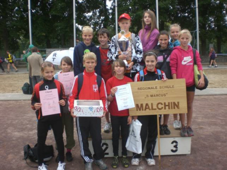 (M.Jahrmärker) Am 22.9.2011 fand in Altentreptow das Altkreisfinale der WK III (Jg.1998-2000) im Wettbewerb “Jugend trainiert für Olympia“ statt. Es traten 6 Schulauswahlmannnschaften an. In der Vorrundenstaffel 2 traf die Auswahl der Marcusschule im ersten Spiel auf die KGS Altentreptow und gewann durch einen Treffer von Eric Martin mit 1:0. Im Duell mit dem zweiten Gruppengegner, dem Gymnasium Malchin, konnte die Mannschaft um Kapitän Ole Völker nicht an die guten Leistungen des Auftaktspiels anknüpfen. Der Spielaufbau konnte sich zwar sehen lassen, vorm Strafraum war dann aber Schluss. Immer wieder scheiterte die „Offensivabteilung“ an der starken gegnerischen Abwehr bzw. am eigenen Unvermögen, den Ball ins gegnerische Tor zu befördern. So blieb es am Ende bei einem leistungsgerechten 0:0. Im Halbfinale hieß der Gegner Pestalozzi-Schule Demmin. Von Beginn an waren die Malchiner die spielbestimmende Mannschaft; doch die zahlreichen Chancen, die sich boten, wurden teilweise kläglich vergeben. Als alle schon mit einem Elfmeterschießen rechneten, erzielte Eric Martin den vielumjubelten Siegtreffer. Im zweiten Halbfinale setzte sich die KGS Altentreptow durch ein Strafstoßtor mit 1:0 gegen die Regionale Schule Jarmen durch, so dass es im Finale zu einem erneuten Aufeinandertreffen der Schulen aus Malchin und Altentreptow kam. Die Kicker von der Marcusschule starteten furios. Nach 2 Minuten stand es durch die Treffer von Patrick Rambatt und Marcel Thürmann schon 2:0; kurz vor der Halbzeit konnte Patrick im Nachsetzen das 3:0 erzielen. Die wenigen Konter der Altentreptower fing die gut organisierte 4-er Abwehrkette mit Niklas Schultz, Hannes Klepper, Paul-Erik Asmus und Max Lange sicher ab. Auch in der 2.Spielhälfte waren die Malchiner die dominierende Mannschaft. Mit einem sogenannten „Traumtor“, einem 20m-Fernschuss ins linke obere Eck, machte Max Lange den Sieg und damit die Qualifikation für das Regionalfinale am 13.10. in Waren perfekt. Die Schulauswahl spielte mit: Niklas Baenitz, Hannes Klepper, Niklas Schultz, Paul-Erik Asmus, Eric Martin, Louis Dill, Josua Schlag, Marcel Thürmann, Tim Meier, Ole Völker, Patrick Rambatt, Oliver Rambatt, Max Lange |