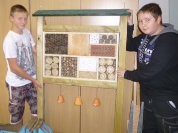 (R.Braun) In den letzten Wochen hatten die Schüler des Wahlpflichtkurses „Umwelt und Technik“ unter Leitung von Herrn Braun noch alle Hände voll zu tun. Ihre Mühe diente einem ganz besonderen Zweck. Die Kinder der KITA „Sonnenkäfer“ in Malchin wünschten sich ein Insektenhotel. Da die Marcuschule als Umweltschule bereits über ein solches verfügt, waren die Acht- bzw. Siebenklässler genau der richtige Ansprechpartner. Eifrig recherchierten sie im Internet, sammelten Materialien wie Zapfen, Holzwolle, Klinkersteine, Astteile u.Ä.. Nach etwa 5 Doppelstunden konnte ein Insektenhotel übergeben werden, auf das die Schüler und ihr Lehrer mit Recht stolz sein können. Hausmeister sowie Kinder der KITA werden es demnächst aufstellen und hoffentlich viel Freude daran haben |