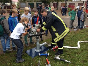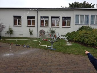 (A.Teggatz) Wenn an einem Vormittag im September auf dem Schulhof der "Siegfried Marcus" Schule eine Bühne aufgebaut wird, die Kreisverkehrswacht zu Besuch kommt, der Grill angeheizt wird und dann auch noch die Feuerwehr vorbei schaut, kann es sich in diesem Monat nur um das Schulhoffest handeln. So geschehen am Freitag, den 20.09.2013 zum Tag der Namensgebung "Siegfried Marcus" Schule Malchin. Bereits 21 Mal wurde dieser Namenstag an der Schule gefeiert. Zuerst wurden 2 Unterrichtsstunden absolviert. Danach verbrachten Schüler und Lehrer gemeinsam auf dem Schulhof den Vormittag bei Sport und Spiel. Wie man sich sicher im Straßenverkehr auf dem Fahrrad bewegt, konnte man bei der Kreisverkehrswacht erfahren. Junge Gesangstalente sangen live Karaoke und die Besten wurden beim Streetball und anderen Sport- und Geschicklichkeitsspielen ermittelt. Von besonderem Interesse war natürlich die Malchiner Feuerwehr. Sie stellte den hauseigenen Verein vor und wer mochte, konnte seinen eigenen Springbrunnen mit Löschgerätezubehör der Feuerwehr zusammenbauen und natürlich ausprobieren. Reißenden Absatz fand die von engagierten Schülern zubereitete Bratwurst frisch vom Grill. Diese Stärkung wurde dankend angenommen, denn das Highlight bildete natürlich wieder das Tauziehen der Klassen in den einzelnen Jahrgangsstufen. Am Ende dieser gelungenen Veranstaltung gab es wie jedes Jahr eigentlich wieder nur Gewinner. Alle hatten Spaß und das ist es doch, was zählt an solch einem Tag. Ach ja, am Vormittag war das Wetter nicht das Beste und es hat sogar etwas geregnet, aber das interessierte an diesem Freitag niemanden wirklich. |