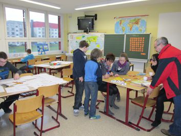 (U.Braun) Für die 16 Mädchen und Jungen der 7b war der Start ins neue Schuljahr schon eine ziemlich aufregende Geschichte. Sie gehören zu jenen Schülern der Marcusschule, deren Klasse neu gebildet wurde. Gesehen hatten sich alle bereits dann und wann, aber in der Regel wenig Kontakt zueinander. Deshalb wurde gleich am zweiten Schultag ein Projekt durchgeführt, welches die Grundlage dafür bilden sollte, dass aus dieser Gruppe ein echtes Team werden kann. An verschiedenen Stationen lernten sich die Schüler genau kennen. Dazu gehört natürlich nicht nur, dass man den anderen beim Namen nennen kann. Wer hat mit mir Geburtstag? Mit wem teile ich ein Hobby? Was haben die anderen so in den Ferien gemacht? Wer ist der größte Schüler der Klasse? Wer hat die längsten Haare? Auf Fragen solcher Art gab es an diesem Tag eine Antwort. Außerdem machten alle beim Lösen gemeinsamer Aufgaben die Erfahrung, wie entscheidend es ist, einander zu vertrauen sowie seine persönlichen Stärken einzubringen. Letztlich überlegten die Siebenklässler noch einmal, was ihnen in ihrer jetzigen Klasse absolut wichtig ist. Dabei sprach sich die Mehrheit eindeutig für Zusammenhalt, gegen die Störung des Unterrichts und gegen das Beschmutzen von Gegenständen aus. Sowohl Schüler, Klassenlehrerin als auch Sozialarbeiter verabschiedeten sich sichtlich zufrieden mit der Gewissheit, dass die 7b einfach klasse wird |