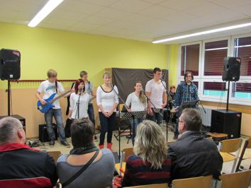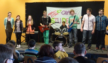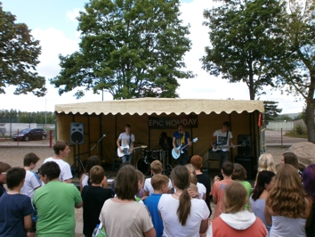 möchte. Dieses Jubiläum war am 12. Juni ein Anlass zum Feiern - und das gleich zweimal: Am Nachmittag gab es ein Schulhofkonzert mit der Berliner Band "Epic Holiday", die bei strahlendem Sonnenschein mit toller Laune, viel Energie und vollem Körpereinsatz ihr Publikum begeisterte. Autogramme mit persönlichen Widmungen und gemeinsame Fotos waren im Anschluss natürlich heiß begehrt. Viele Schüler kamen mit den Musikern ins Gespräch, ja sogar Handynummern wurden ausgetauscht. Am Abend fand im Stadthaus die alljährliche Schülerparty statt. Auch hier traten die vier Jungs von "Epic Holiday" noch einmal auf, um die Stimmung für die anschließende Disko mit DJ Arno so richtig anzuheizen. Versorgt mit Hot Dogs von der Klasse 8a, alkoholfreien Cocktails vom ChillTeam und toller Musik hielt es keinen einzigen Gast auf seinem Stuhl - es wurde getanzt, gerockt, gefeiert. |