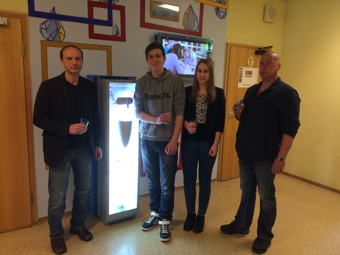 (A.Teggatz) Als die ersten Skizzen von der Kunstlehrerin Frau Teggatz an die Wand gegenüber dem Sekretariat der "Siegfried Marcus" Schule aufgetragen wurden, begann wieder einmal das große Rätselraten bei Schülern und Lehrern der Schule. Was sollte es dieses Mal werden? Schnell fanden sie des Rätsels Lösung mit Hilfe des Schülerrates. Mit tatkräftiger Unterstützung des Fördervereins, insbesondere durch die Vereinsmitglieder Herrn Schmidt und Herrn Teggatz, fand ein lang ersehntes Projekt seine Verwirklichung. Die Marcusschule bekommt einen Wasserspender. Bereits im letzten Schuljahr wurde diese Projektidee in einer Schülerratssitzung geboren und fand nun einen erfolgreichen Abschluss. Mit großer Unterstützung zahlreicher regionaler Unternehmen konnten alle notwendigen Arbeiten, natürlich mit Schülerbeteiligung, schnell und koordiniert ausgeführt werden. Allen Beteiligten und Unterstützern nochmals herzlichen Dank für ihr Engagement. Am 15.April 2015 wurde der Wasserspender offiziell an der Schule in Betrieb genommen und erfreut sich zunehmender Beliebtheit nicht nur bei den Schülern. |