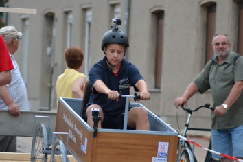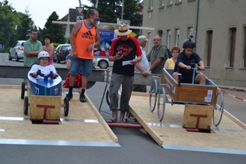 (A.Teggatz) Auf der Suche nach einem extra Höhepunkt bewiesen die Organisatoren des diesjährigen Stadtfestes ein besonderes glückliches Händchen. Es wurde ein Seifenkistenrennen veranstaltet. Nach unzähligen Stunden der Vorbereitung starteten am Sonnabend um 16:00Uhr der Bürgermeister der Stadt Malchin und Clown Flori das erste Malchiner Seifenkistenrennen. 29 Teams in 2 verschiedenen Klassen fuhren unter dem Jubel von mehr als tausend Zuschauern spannende Rennen. Kurzzeitig einsetzender Regen wurde als willkommene Abkühlung an diesem sehr heißen Renntag begrüßt. Unsere „Siegfried Marcus“ Schule war mit zwei Teams, betreut von den Schulfördervereinsmitgliedern Andreas Teggatz und Michael Schmidt, in der „Kids“-Klasse am Start. Die Seifenkiste wurde zusammen mit den Firmen Isolierung/Verschäumung Swinty, Mecotech Swinty, gestaltet von Udo Dohms unter der Leitung des Renningenieurs Clemens Kölzow in Zusammenarbeit mit den „Technikern“ Lucas Haucke und Benedict Dettmann an den Start gebracht. Nun lag alles an den beiden „Rennfahrern“ Mattes Swinty und Till Breitsprecher. Sie kämpften um jeden Meter und jede Sekunde. Zur Siegerehrung angetreten wurde es zur Gewissheit! Beide Teams standen auf dem Treppchen. Zwar nicht ganz oben, aber der zweite und dritte Platz wurden erreicht. Für das erste Mal wirklich ein super Ergebnis! Resümee der Veranstaltung: Ein tolles Event mit Traditionspotential. Nochmals ein riesengroßes Dankeschön an alle Mitwirkende, Unterstützer, Sponsoren und Freunde für die super Zusammenarbeit bei der Gestaltung dieses Tages. |