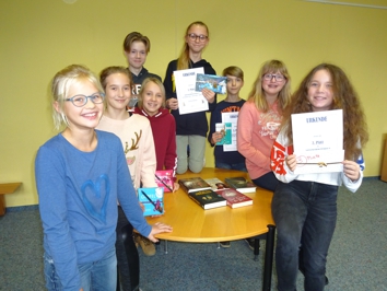 (U.Braun) Die Marcusschüler haben eine neue Lesekönigin, denn Vorweihnachtszeit ist an der Schule Lesezeit. Insgesamt 8 Kandidaten aus den drei 6. Klassen stellten kürzlich in der Stadtbibliothek ihr Können unter Beweis. Zur Jury gehörten neben Lehrern auch Schüler der Klasse 8a. Beim Vorlesen der unbekannten Texte lieferten sich alle ein Kopf-an-Kopf-Rennen. Insbesondere die vielfältige Buchauswahl trug dazu bei, dass für ausreichend Spannung sowie gute Unterhaltung gesorgt war. Selbstverständlich war zu Beginn der zweiten Runde die Anspannung noch einmal besonders groß. Die Schüler lasen aus dem Kinderbuch ,,Enno Anders“ von A. Frank, ein Mutmacherbuch für Kinder ohne Gymnasialempfehlung. Auf dem Siegertreppchen der Jubiläumsrunde konnte letztlich Paula S. aus der 6a ihre Urkunde entgegennehmen. Sie wird die Schule beim nächsthöheren Entscheid 2019 vertreten. |