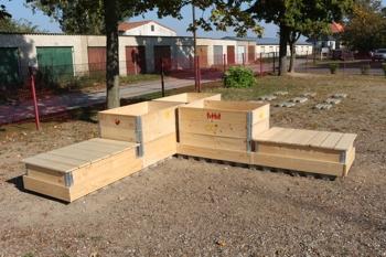 nun sichtbare Formen auf dem Pausenhof am Haus 1 SMS an. Mit viel handwerklichem Geschick und Ausdauer wurden durch die Schülerinnen und Schüler vor den Sommerferien die notwendigen Arbeiten an den Konstruktionsteilen vorgenommen. Unterstützt wurden sie dabei von einem AWT-Lehrer, Herrn Streit, und Mitarbeitern der Firma Cargill Deutschland GmbH Malchin. Die Firma „Friedhelm Dahms Malerbetrieb“ stellte uns nicht nur eine Halle zur Verfügung, Herr Dahms bzw. Mitarbeiter der Firma unterstützen und leiteten jede Woche die notwendigen Arbeiten mit an. In den letzten 2 Wochen wurde mit Hilfe von einigen Schülerinnen und Schülern der jetzigen 10. Klasse die Aufbauten vor Ort vorgenommen. Als erstes „Bauwerk“ wurden die Sitzflächen mit den angeschlossenen Hochbeeten aufgestellt und noch am selben Tag durch die Schülerinnen und Schüler der Orientierungsstufe ausprobiert und für „GUT“ befunden.Die finale Ausgestaltung der Hochbeete und deren weitere Farbgestaltung erfolgen in einem angeschlossenen Projekt durch die Schülerinnen und Schüler der 10. Klasse unter der Anleitung mehrerer Lehrkräfte. In einem zweiten Schritt wurde die Bodenplatte für das Verkaufshaus vorbereitet. Die Grundlage wurde durch die Firma Georg Koch GmbH Malchin vorgenommen. Mit einem kleinen Team aus Hausmeister, Schüler und einem AWT-Lehrer ist die Platte kurz vor dem einsetzenden Regen wasserdicht verpackt vorbereitet und wartet auf ihr „Häuschen“. An dieser Stelle möchte ich als Projektleiter zunächst allen Firmen und Institutionen danken, die unsere Schülerinnen und Schüler bei diesem Projekt unterstützt haben. Einen ausführlichen Abschlussbericht finden Sie in der nächsten Ausgabe. M. Schmidt - Projektleiter |